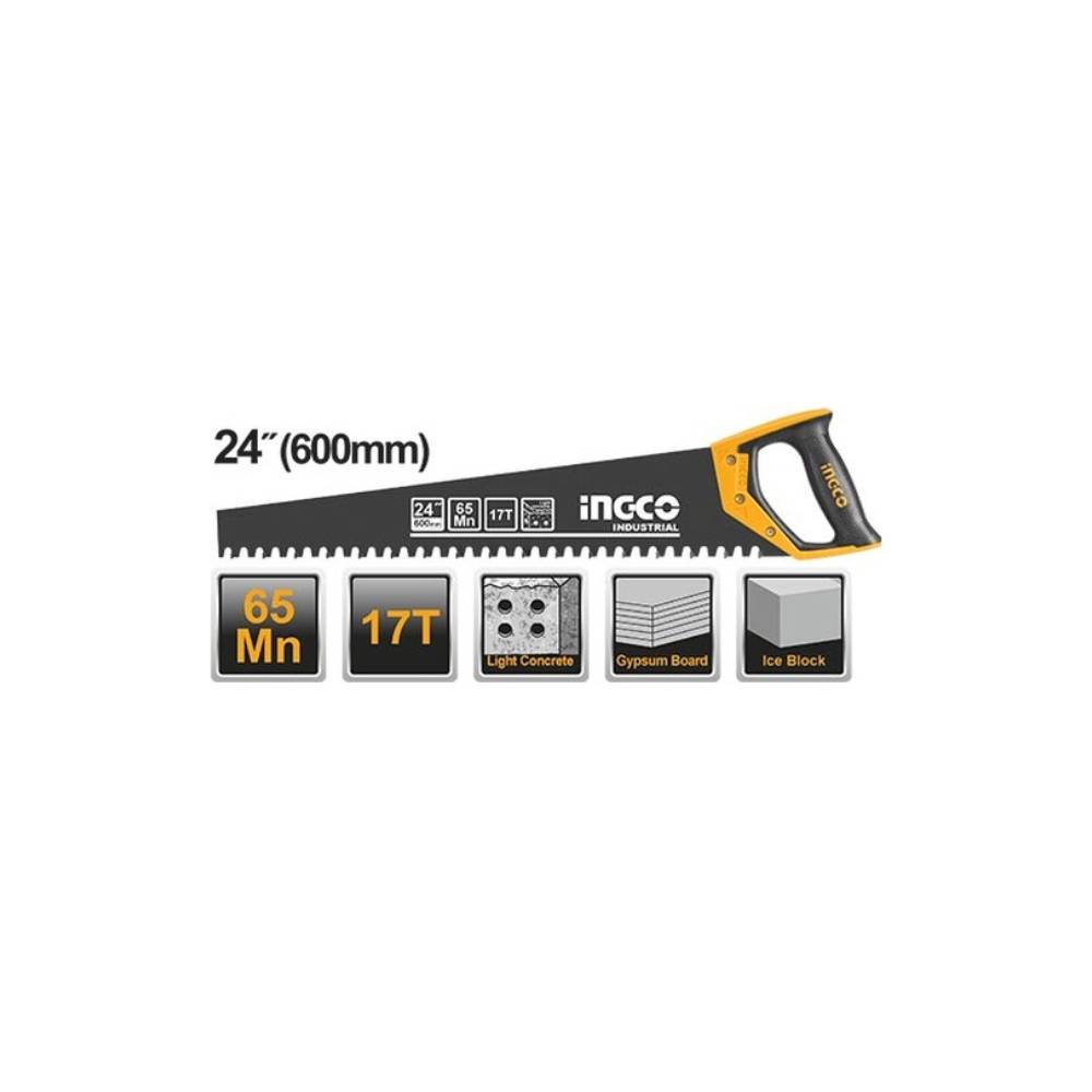 Ingco Gaz Beton Testeresi 24 inç, gazbeton, tuğla, blok ve benzeri yumuşak yapı malzemelerini hızlı ve etkili şekilde kesmek için tasarlanmış dayanıklı el testeresi modelidir. Geniş bıçak yapısı ile pratik kullanım sunar.